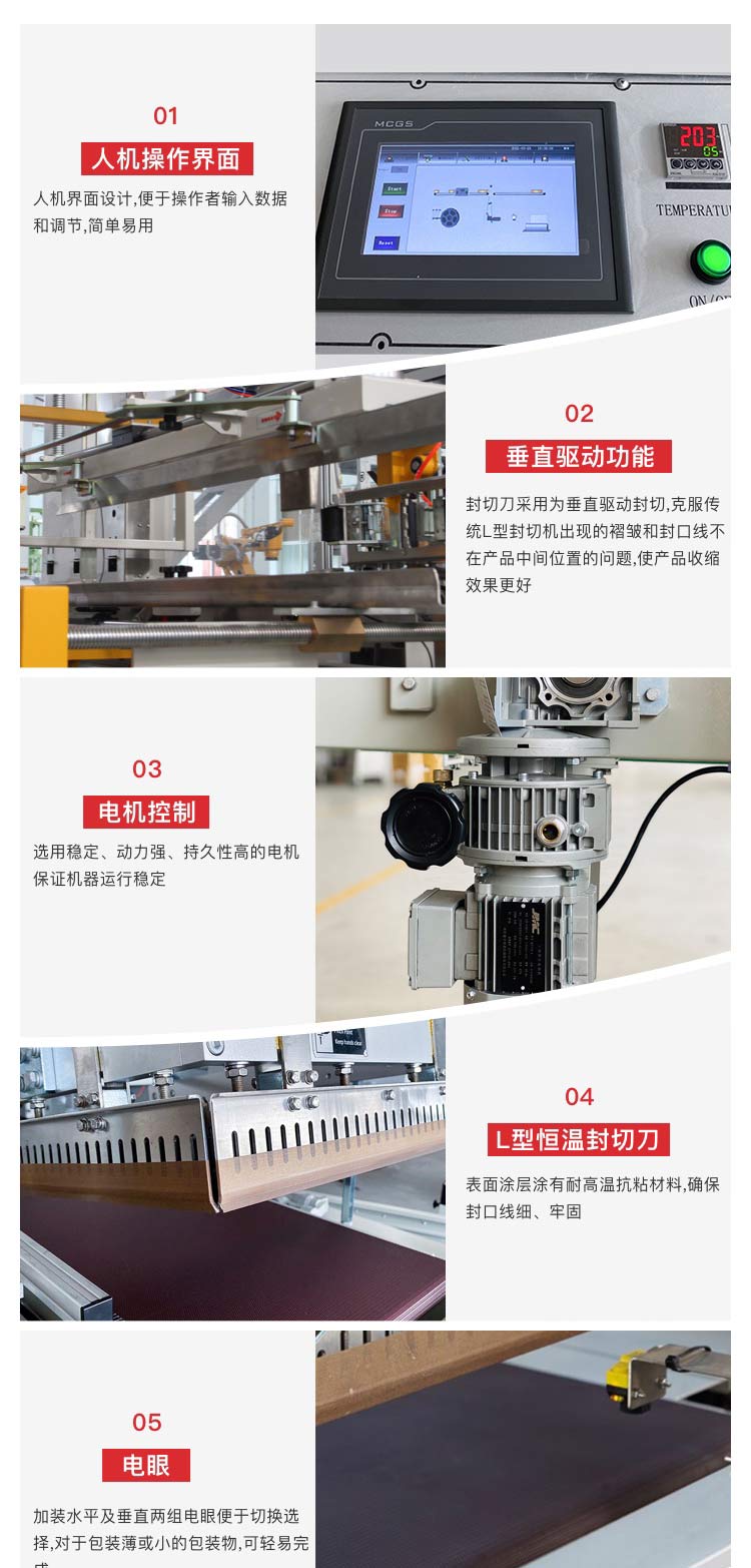 介紹:全自動L型垂直上下封切收縮機是在L型封切收縮包裝機的基礎上升級改造的一款設備,主要針對較高、較薄的產品封切收縮,可自動完成送料、套膜、封切、收縮等步驟,保證其封口線處于中間位置,每分鐘產量可達15-40件,適合POF膜和膠聯膜,自動吹膜,封口線細,整齊。該款封切收縮包裝機在化妝品行業應用廣泛,也適用于印刷、彩盒、日化、汽配、五金、食品等行業。