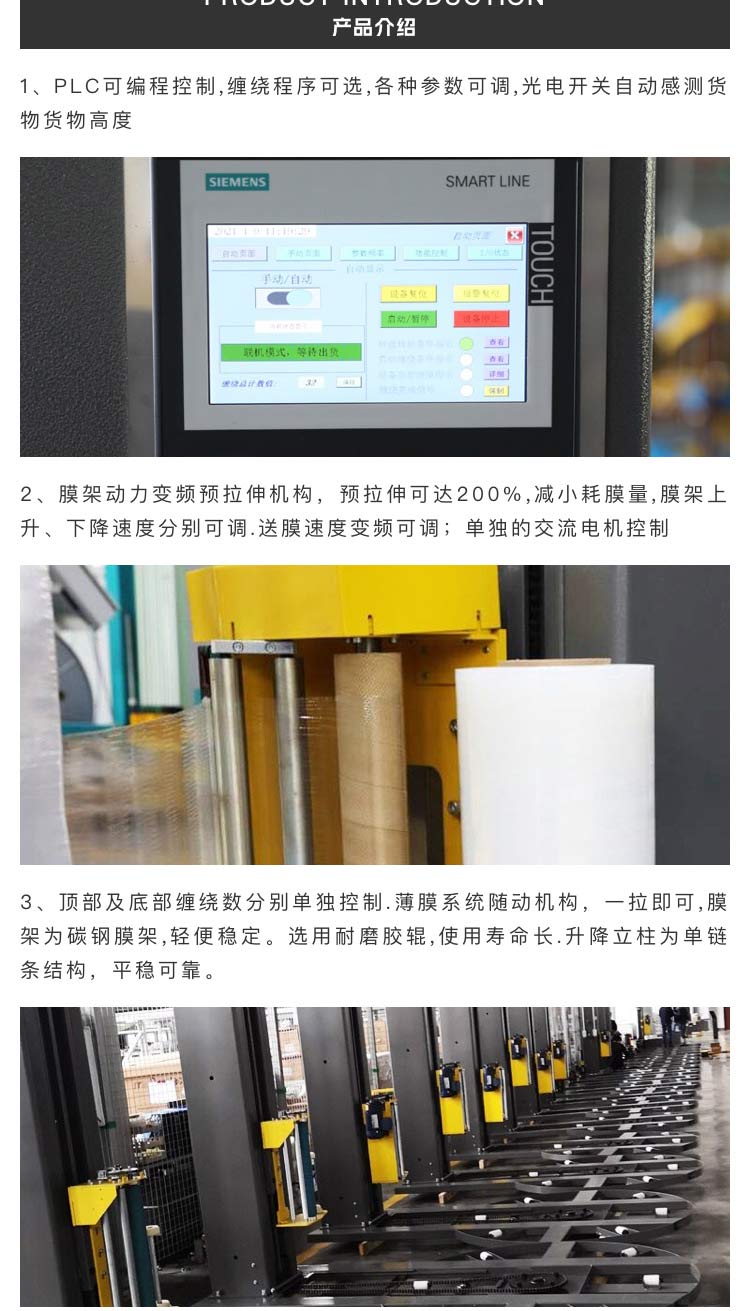 介紹:PLC可編程控制,纏繞程序可選。 人機界面式文本控制顯示系統,實時顯示設備運行狀況。 德國倍加福光電開關自動感測貨物高度。 纏繞層數、運行速度、薄膜張緊度任意可調,操作方便簡單。 獨立變頻控制預拉伸自動送膜系統,拉力自由調整。 頂部及底部纏繞圈數分別單獨控制,1-9圈自由調節。 自動、手動可切換,幾乎無需日常維護。