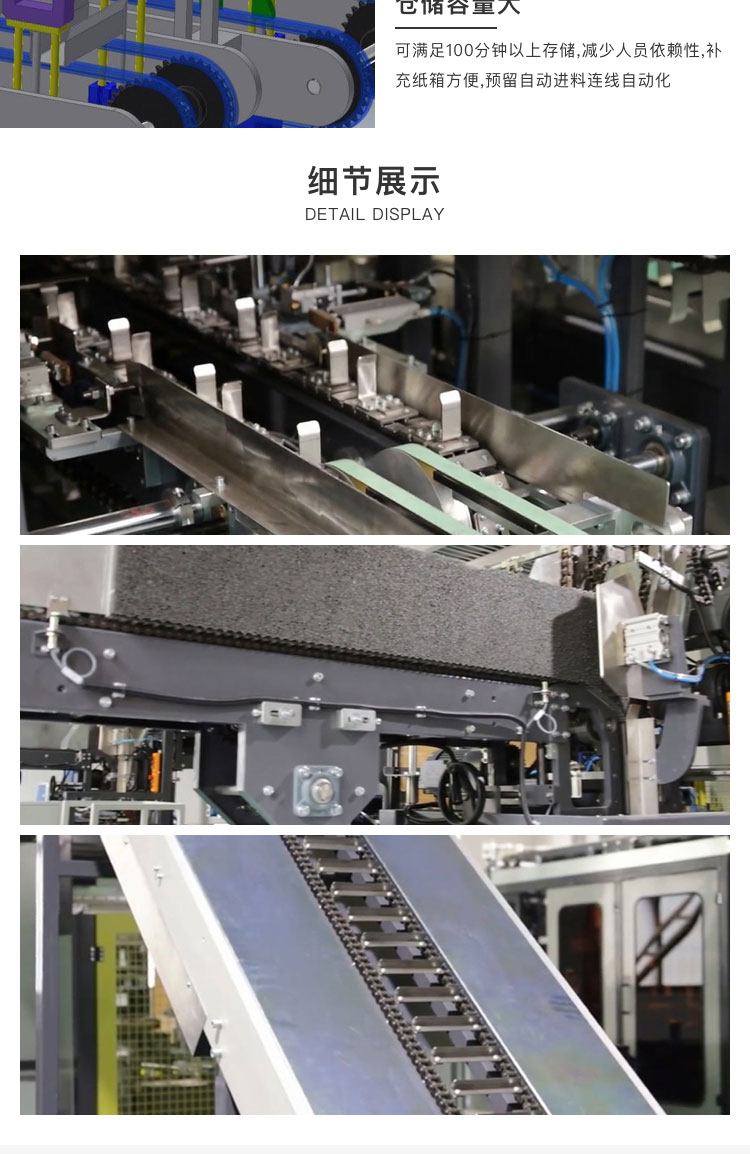 介紹:HW-HT-XH01A采用多吸盤連續(xù)式吸盤吸盒,整機由PLC人機界面控制,采用了鏈排式連續(xù)運動原理,從而保證了高速運行的穩(wěn)定性。依據(jù)客戶對產(chǎn)品所需做聯(lián)機儲備接口。物料通過輸送電機驅(qū)動階梯式機械吸盤動作經(jīng)轉(zhuǎn)輪至裝盒機輸送系統(tǒng)上,并在這個過程中完成進(jìn)料系統(tǒng)。同時具備檢測功能,并設(shè)有自動調(diào)節(jié)功能使之運行速度能與前段計數(shù)包裝機的生產(chǎn)產(chǎn)能貼切匹配。該設(shè)備可與連續(xù)爐設(shè)備,膜包機,裝箱機等前后道設(shè)備相連接形成一條龍包裝系統(tǒng),滿足企業(yè)生產(chǎn),降低勞動力,節(jié)省包材等效果。