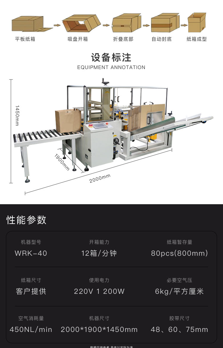 介紹:紙箱自動成型封底機WRK-40立式開箱速度達到12箱/分鐘的開箱機,與同級別立式開箱機相比價格低50% 01: 紙箱自動成型機采用獨立技術(shù)制造,并選用進口零部件,電器元件及氣動元件;采用立式儲存紙板方式,并可隨時補充紙箱板,不需停機 02: 封底機合理化設(shè)計,同步吸取成型,招底與封底一次同步成型;體積經(jīng)巧,機件性能精密,運作過程無振動,運轉(zhuǎn)穩(wěn)國壽命長,效率高 03: 適用于同一時間同種紙箱尺寸包裝使用,如需變換紙箱規(guī)格,手動調(diào)節(jié)即可,所需時間1-2分鐘, 04: 加裝適明有機玻璃防護罩,開門自動停止,避免操作意外