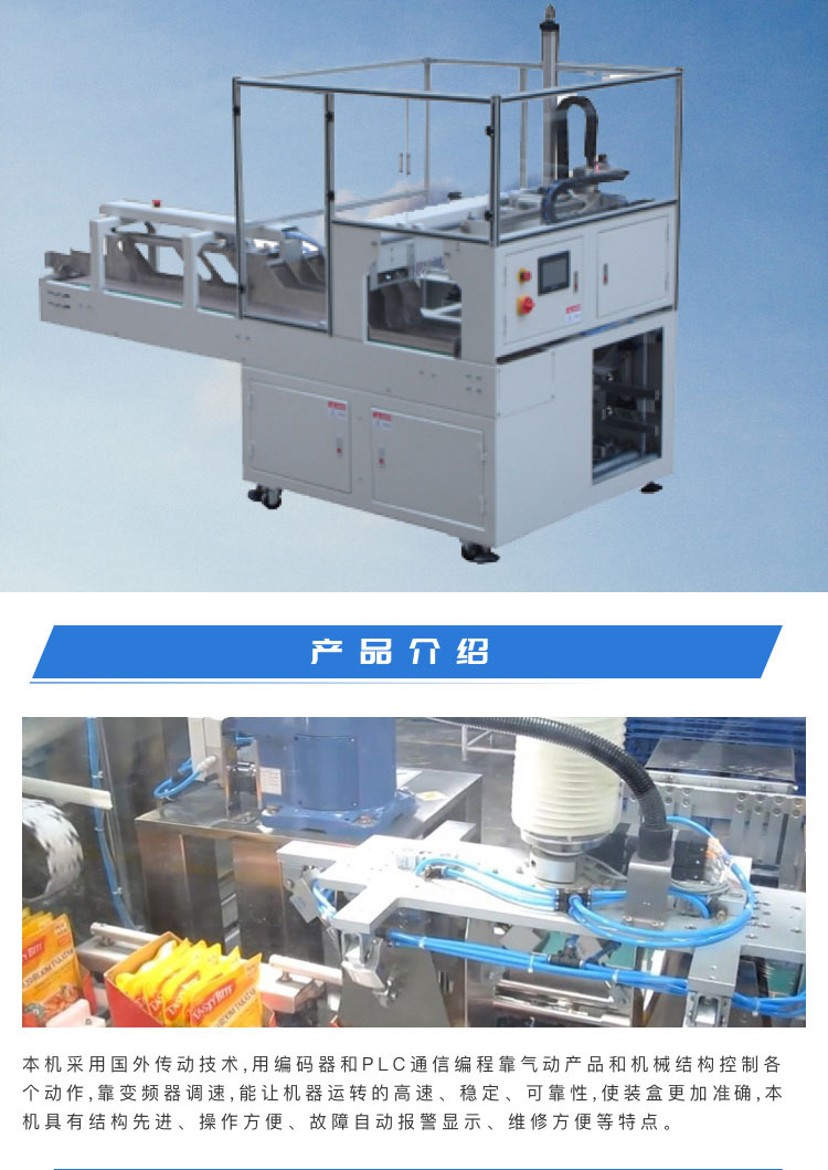 介紹:本機(jī)采用國外傳動技術(shù),用編碼器和PLC通信編程靠氣動產(chǎn)品和機(jī)械結(jié)構(gòu)控制各 個(gè)動作,靠變頻器調(diào)速,能讓機(jī)器運(yùn)轉(zhuǎn)的高速、穩(wěn)定、可靠。本設(shè)備可實(shí)現(xiàn)自動下料,開盒,關(guān)盒,黏膠等。 解決您的三大包裝難題實(shí)現(xiàn)自動化生產(chǎn):1、大大降低企業(yè)的生產(chǎn)成本,單臺裝盒機(jī)八小時(shí)生產(chǎn)力約為3-5萬盒,按此計(jì)算每臺裝盒機(jī)可省人工為10-15人;2、人工裝盒,易污染、易出差錯.車間多一人,更是多一個(gè)污染源.人工裝盒有時(shí)會漏裝說明書或內(nèi)容物;3、提高企業(yè)生產(chǎn)力,從企業(yè)管理角度上來講,管理人難,管理設(shè)備易。 產(chǎn)品別稱:裝箱機(jī)、裝盒機(jī)、自動裝箱機(jī)、自動裝盒機(jī)、跌落式裝箱機(jī)、側(cè)推式裝箱機(jī)、抓舉式裝箱機(jī)、機(jī)器人裝箱機(jī)、一片式裹包機(jī)、條形全自動裝盒機(jī)。