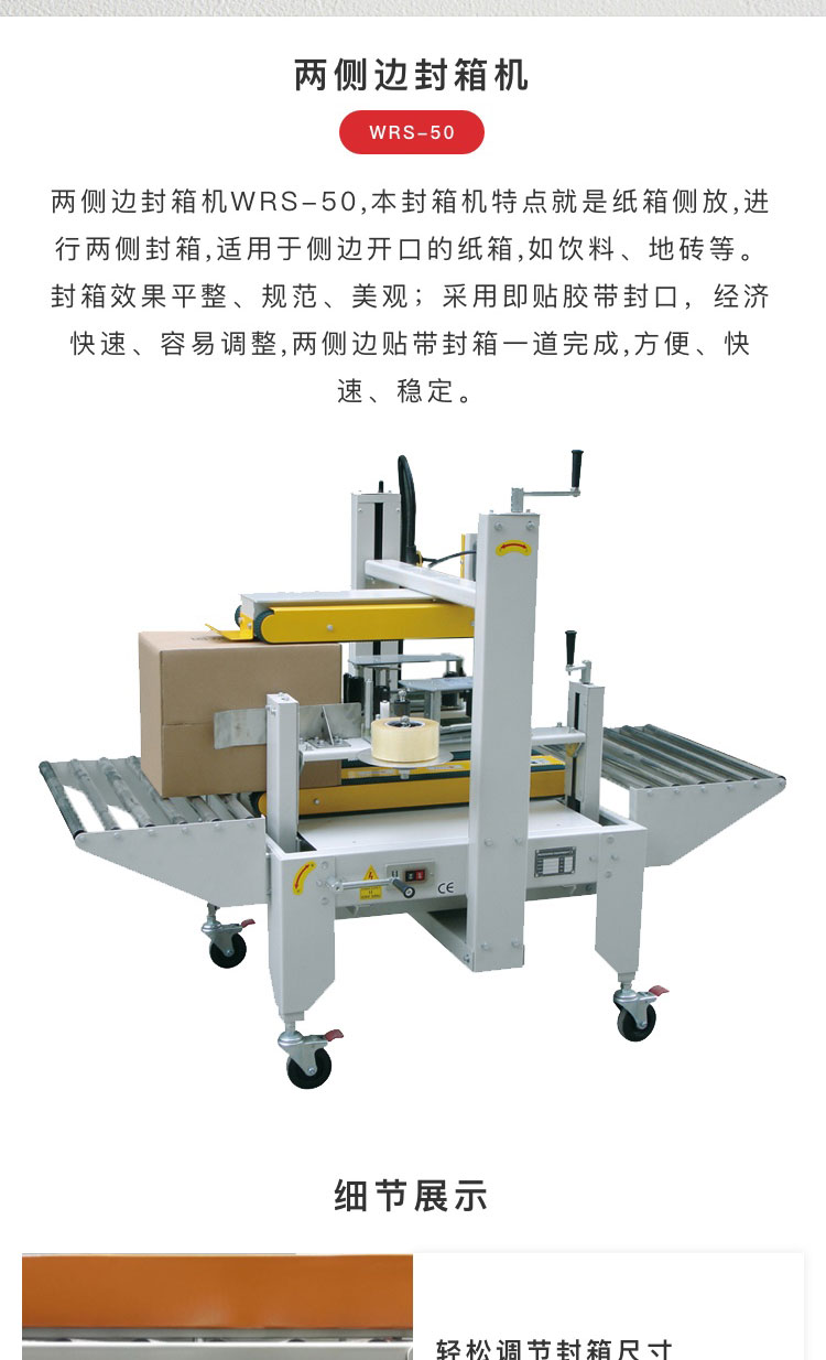 介紹:兩側邊封箱機WRS-50,本封箱機特點就是紙箱側放,進行兩側封箱,適 用于側邊開口的紙箱,如飲料、地磚等。封箱效果平整、規范、美觀;采用 即貼膠帶封口,經濟快速、容易調整,兩側邊貼帶封箱一道完成,方便、 快速、穩定。 產品別稱:全自動封箱機、工字封箱機、一字封箱機、十字封箱機、四角邊封箱機、上下驅動封箱機、左右驅動封箱機、快遞封箱機、電商封箱機、膠帶封箱機、快速封箱機、可調封箱機、伺服封箱機